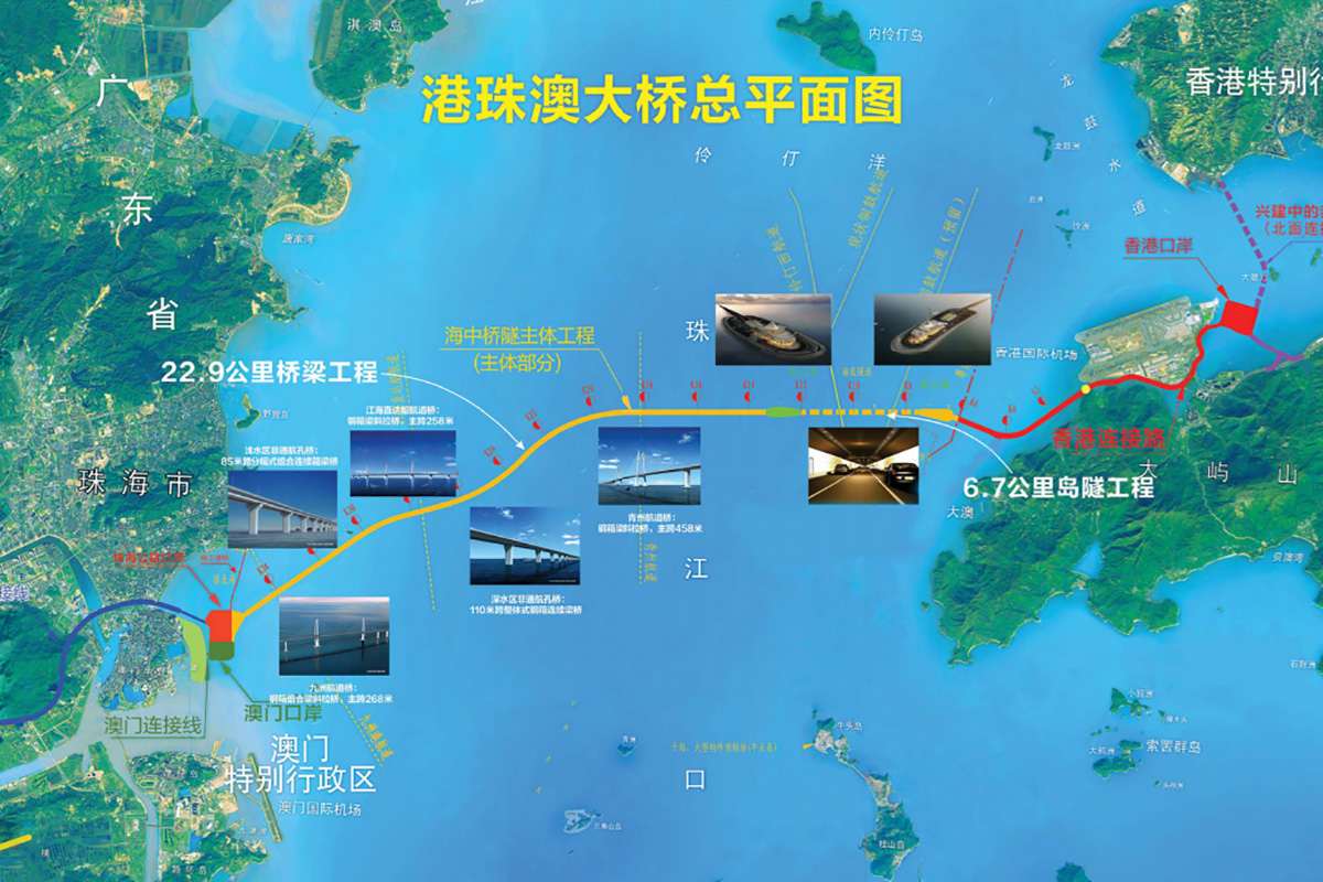 港珠澳大桥(英文名称:Hong Kong-Zhuhai-Macao Bridge)是中国境内一座连接香港、广东珠海和澳门的桥隧工程,位于中国广东省珠江口伶仃洋海域内,为珠江三角洲地区环线高速公路南环段。港珠澳大桥于2009年12月15日动工建设;于2017年7月7日实现主体工程全线贯通;于2018年2月6日完成主体工程验收;同年10月24日上午9时开通运营。
